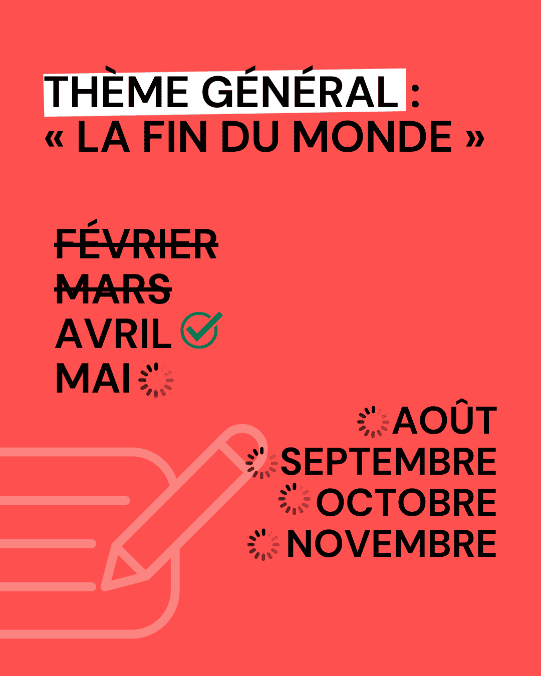Pour la première édition de nos concours d’histoires courtes, la thématique principale est : « La fin du monde. » Ensuite, tous les mois, nous vous révélons le thème plus précis correspondant au concours en cours. Attention, il faut donc bien avoir en tête, si vous décidez de participer, que votre manuscrit doit s’inscrire dans la thématique mensuelle ET dans le thème général pour ne pas être hors sujet. Chaque mois, les thématiques vous invitent à explorer un univers ou un genre littéraire différent !